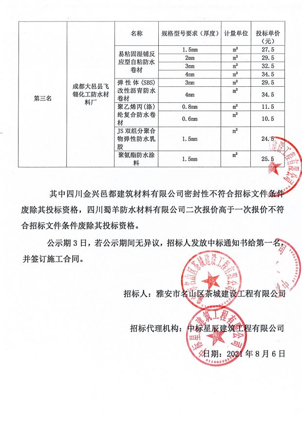 成雅新城人才公寓項(xiàng)目防水材料采購中標(biāo)公示