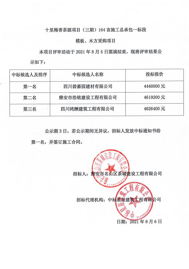 十里梅香茶源小鎮(zhèn)(三期)164畝施工總承包一標(biāo)段模板、木方采購中標(biāo)公示