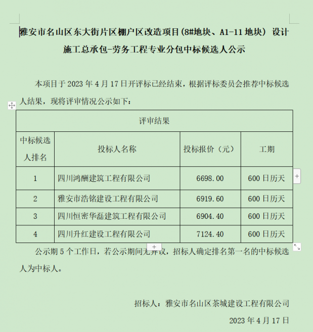 雅安市名山區(qū)東大街片區(qū)棚戶區(qū)改造項(xiàng)目(8#地塊、A1-11地塊) 設(shè)計(jì)施工總承包-勞務(wù)工程專業(yè)分包中標(biāo)候選人公示